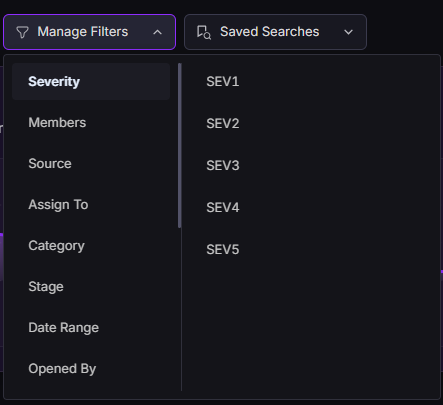 - The Manage Filters option lets the user filter the results by choosing between a variety of filters (e.g., Severity, Assign To, Status, Category, Date range).