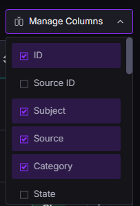 - Use Manage Columns to select which fields/columns appear in the incident table (e.g., Master ID, Subject, Category, Source etc).