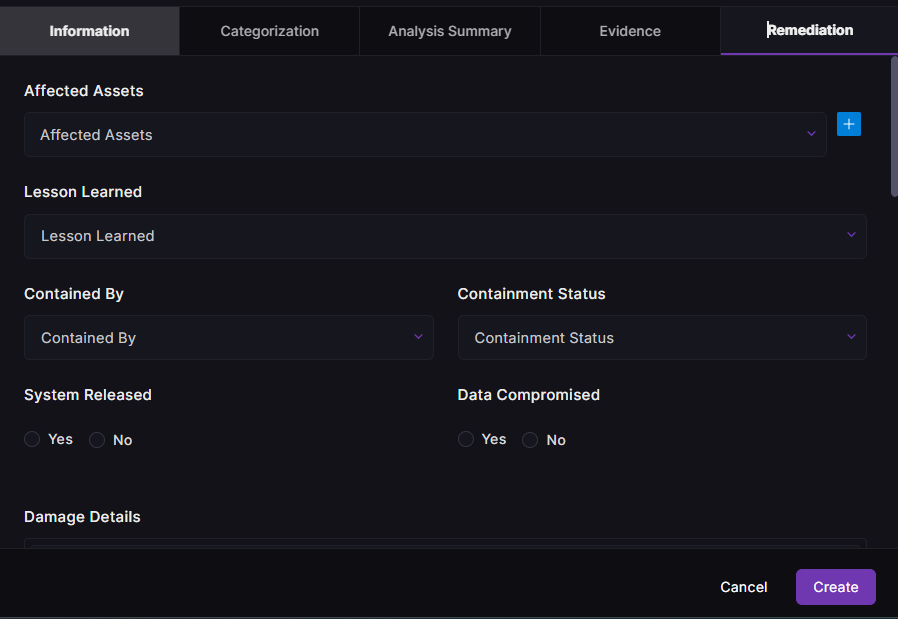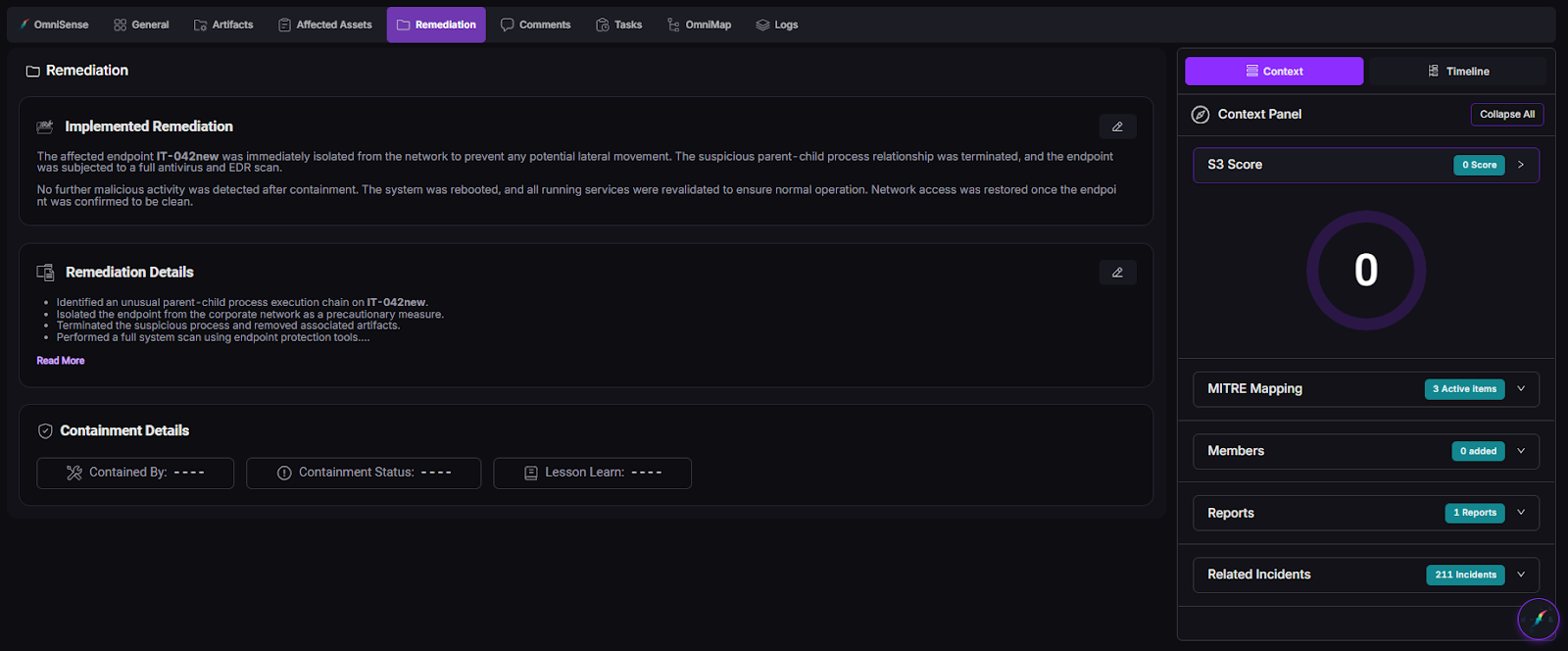 The Remediation tab ensures that all containment and recovery activities are well-documented and verifiable. It strengthens accountability, supports post-incident reviews, and contributes to continuous improvement in security operations by capturing both technical and procedural insights.