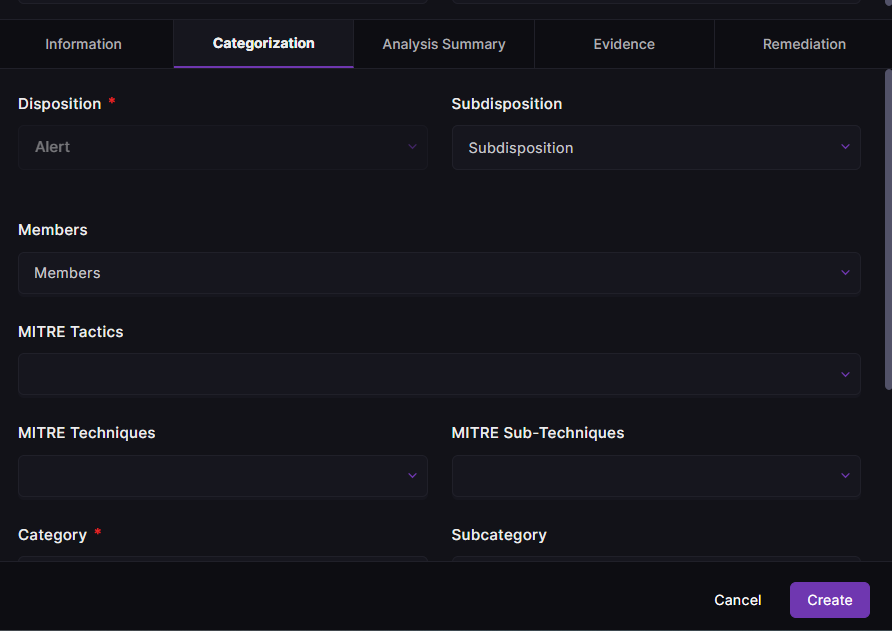 The Categorization tab helps classify alerts with precise contextual and tactical details, ensuring consistent tagging, mapping, and automation within SIRP. It standardizes how alerts are understood and acted upon across the SOC.