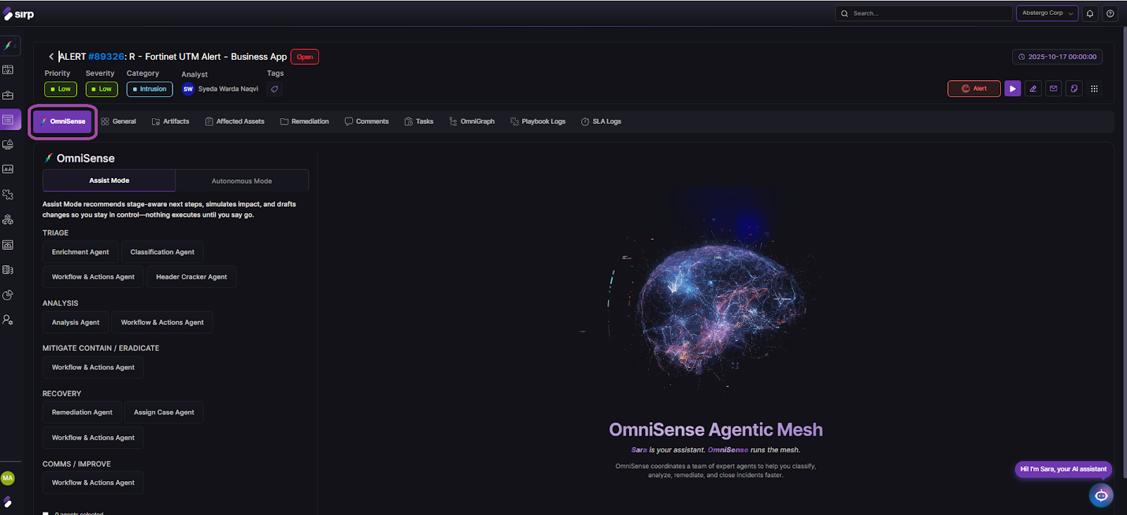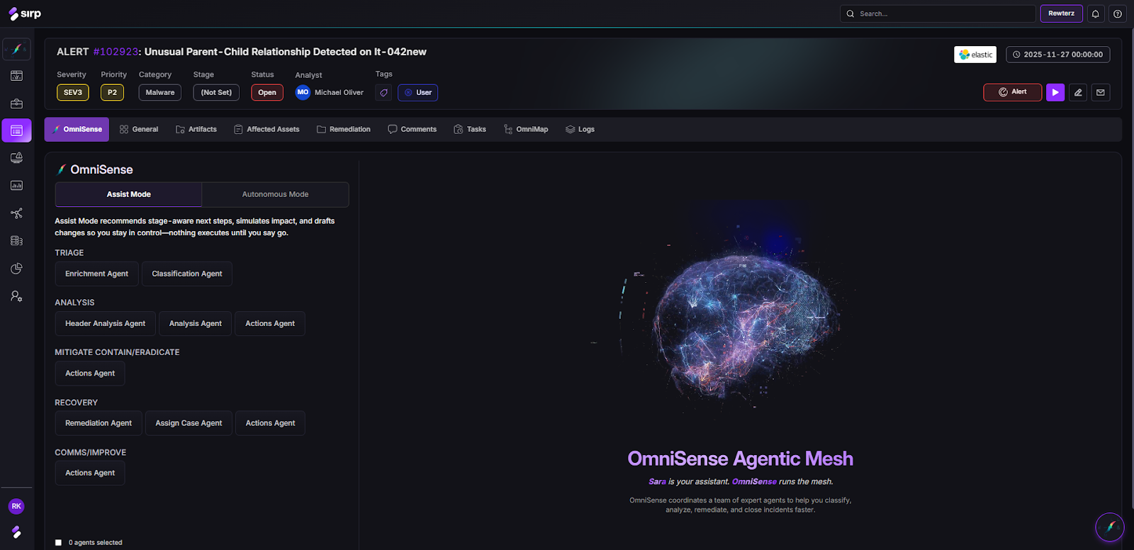 At its core is the OmniSense Workbench, a decision centric interface powered by SIRP’s agentic mesh and security-trained LLM. Here, analysts don’t just view incidents; they collaborate with intelligent agents delivering real-time summaries, automated enrichment, contextual recommendations, and next-step actions.