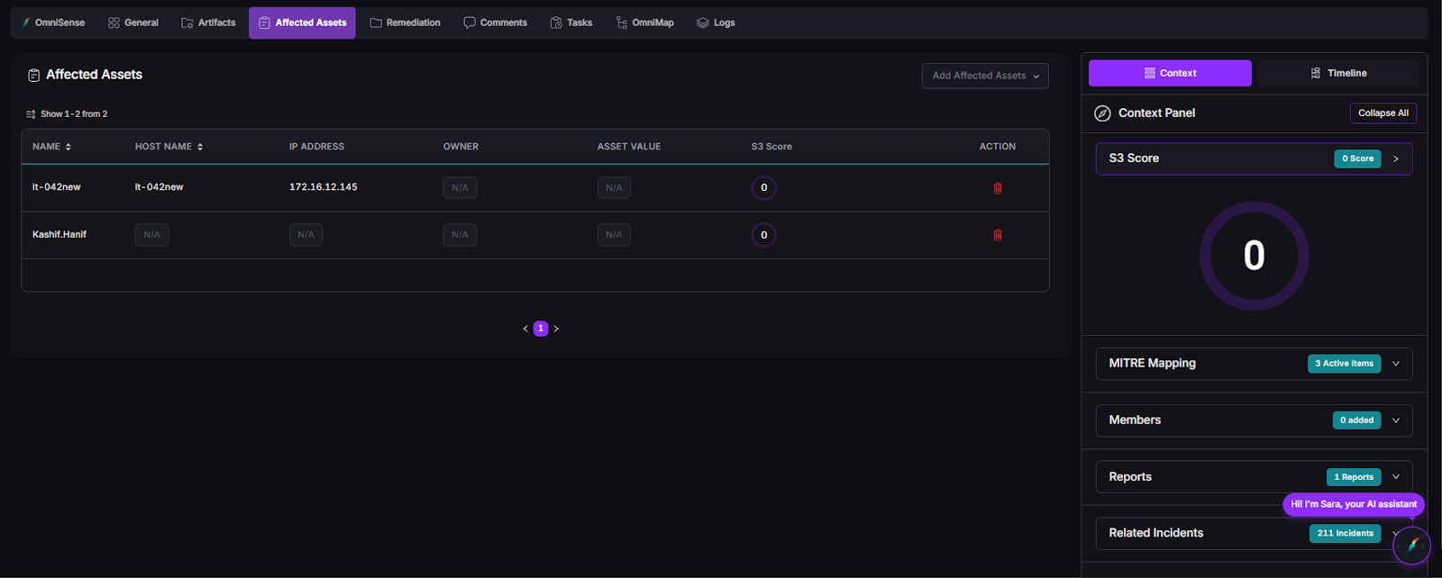 - Affected Assets – Lists the systems, endpoints, or applications impacted by the incident. Analysts can add multiple assets using the “+” button.