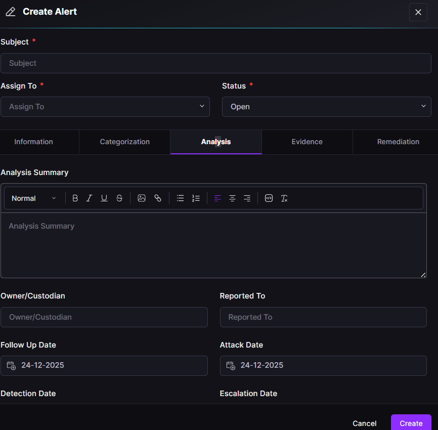 - Create – Saves the evidence entry into the alert or incident record, making it accessible for future reference and reporting.