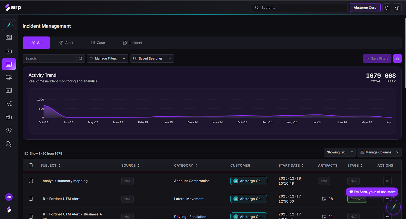 The Incident Management module in SIRP is the central command hub for analysing, investigating, and resolving security incidents. Designed to accelerate response without compromising auditability.