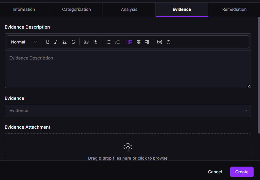 - Evidence Attachment – Enables uploading supporting files or artifacts directly related to the evidence entry. The “+” button is used to add multiple attachments if needed.