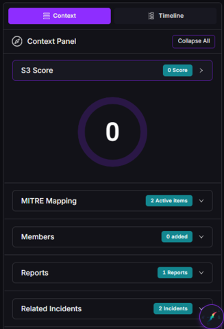 The Context Panel provides a consolidated, real-time snapshot of an incident’s risk, mappings, and relationships, enabling quick understanding without leaving the main view.
